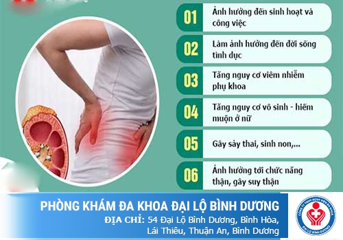 ➢ Dẫn đến nhiễm trùng thận, suy thận: Các vi khuẩn gây bệnh từ bàng quang sẽ bắt đầu đi ngược dòng lên thận gây hại cho thận, dẫn đến viêm, nhiễm trùng và nguy hiểm hơn là suy thận. Một khi thận suy tất cả mọi hoạt động của cơ thể đều bị ảnh hưởng và nguy cơ cao phải chạy thận, đe dọa đến tính mạng người bệnh.