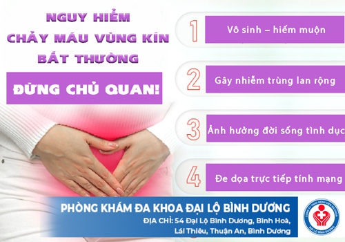 Vùng kín chảy máu bất thường là dấu hiệu cảnh báo các bệnh lý phụ khoa tiềm ẩn, không nên chủ quan hay tự điều trị tại nhà. Ngay khi phát hiện các dấu hiệu bất thường, chị em nên nhanh chóng đến Phòng Khám Đa Khoa Đại Lộ Bình Dương để được tư vấn và hỗ trợ điều trị kịp thời, tránh để bệnh tiến triển nặng, ảnh hưởng đến sức khỏe và khả năng làm mẹ sau này.